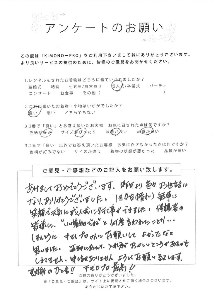 あけましておめでとうございます。昨年より色々お世話になりありがとうございました!1月4日(晴れ)無事に笑顔で元気に成人式に行く事ができました。保護者の皆様に「いい着物だね」と何度言われたことか・・・。ほんとうにキモノプロさんにお願いしてよかったなと思いました。返却にあたり入れ方がおかしいところがあるかもしれません。申し訳ありません。よろしくお願い致します。感謝のひと言!!キモノプロ最高!!