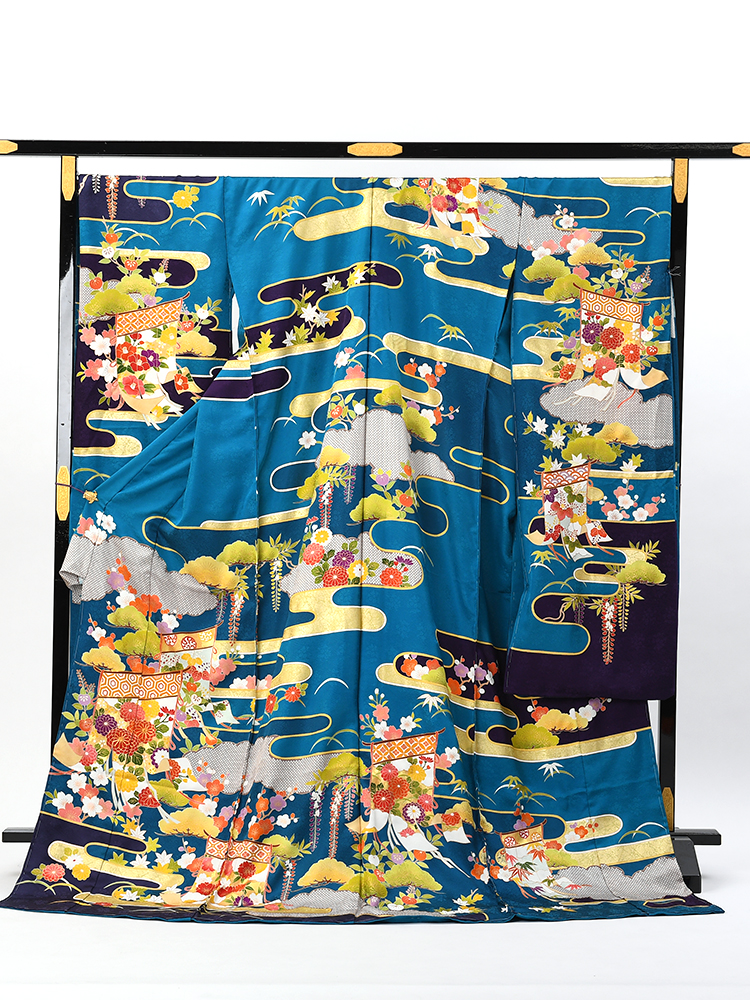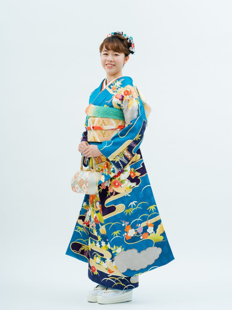 :少し緑の入った鮮やかなブルーがとてもきれいな、几帳と霞の柄の振袖です。