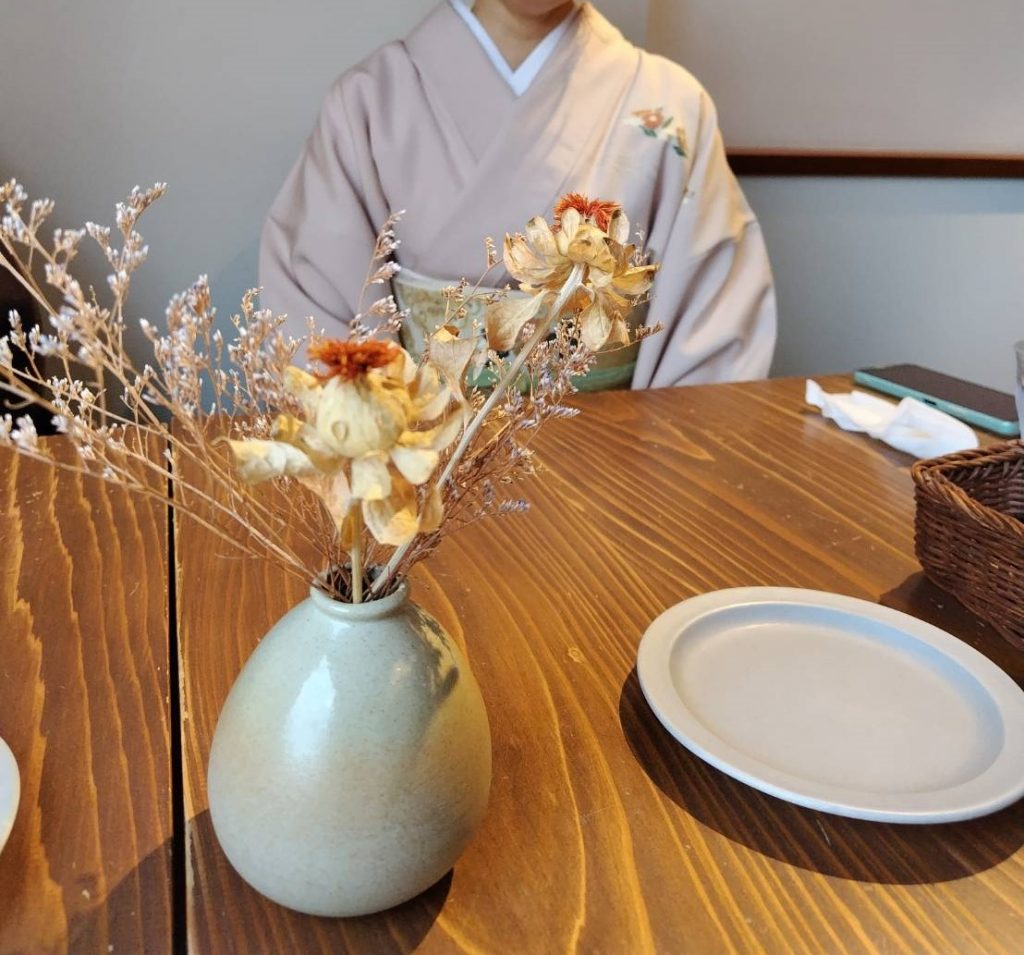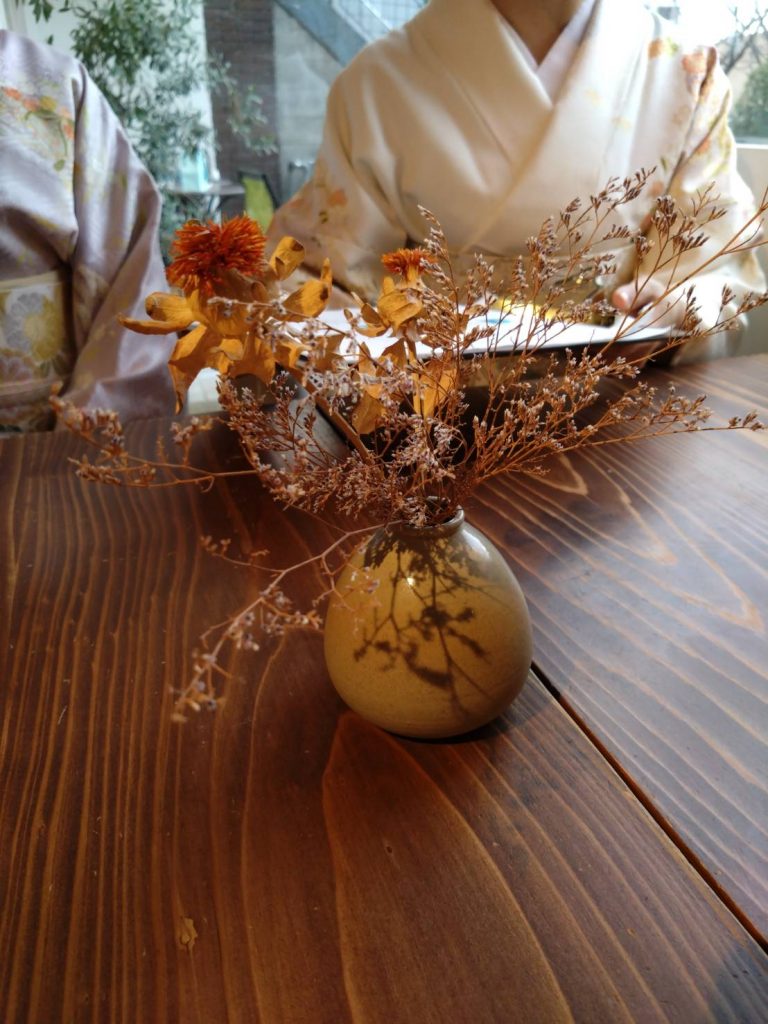 パフェが出てくるまで少しかかる間は着物姿でおとなしくまってます・・・🍓