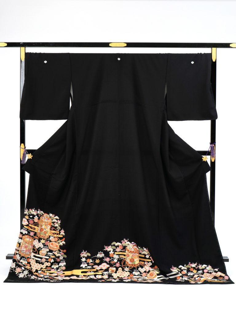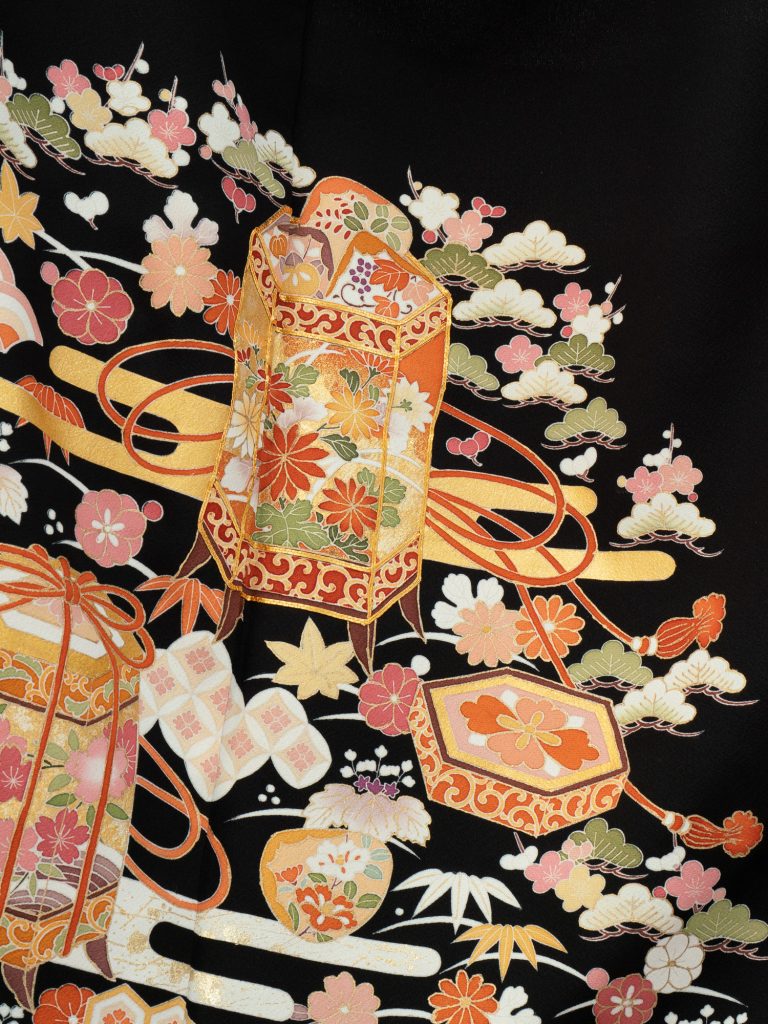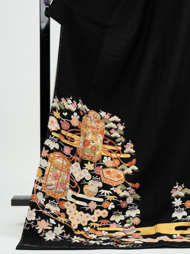 貝桶に松竹梅、亀甲、唐花などの様々な格式高い柄やお祝い柄の入った黒留袖。