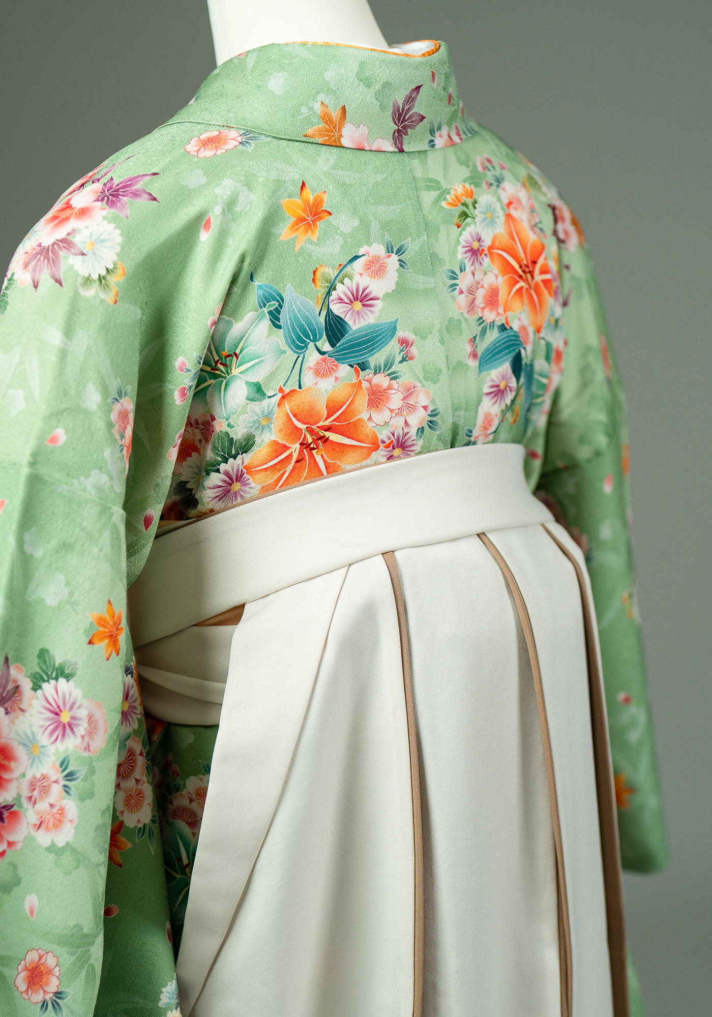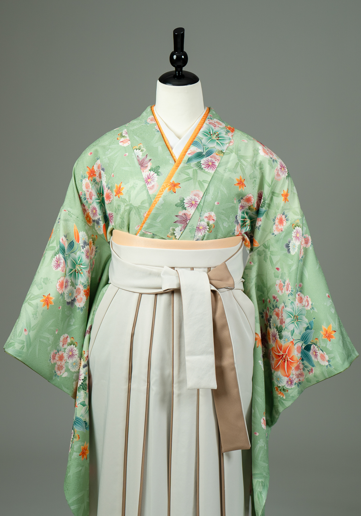 正絹の小振袖です。袴と合わせて卒業式にお召頂けます。キモノプロオリジナルのなので誰ともかぶりません。淡い黄緑の生地に洋花の優しい雰囲気の柄です。2-m2は色違いです。袴の色は変更可能です。