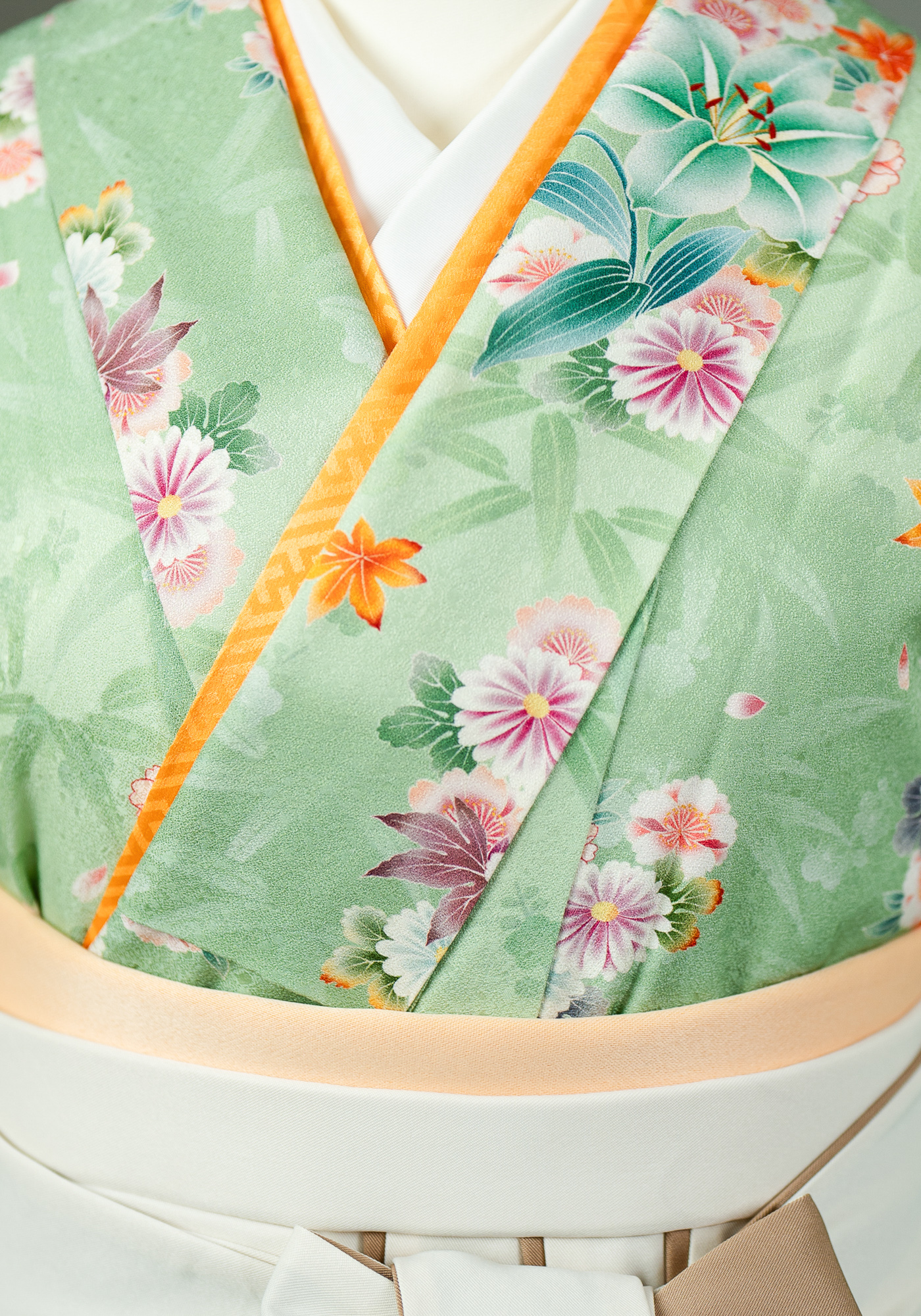 ■【高級卒業式袴レンタル】2-1 卒業式の袴レンタル・正絹二尺袖着物「黄緑地 洋花」 サイズ 花柄