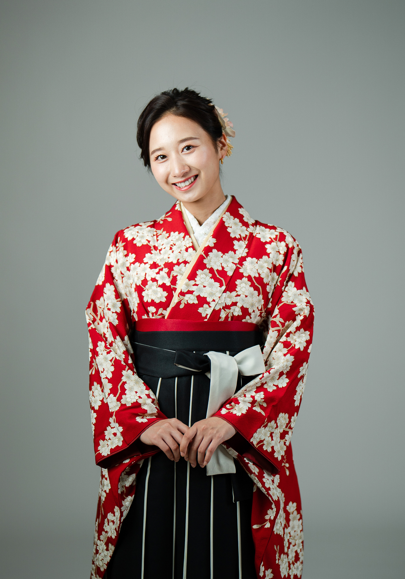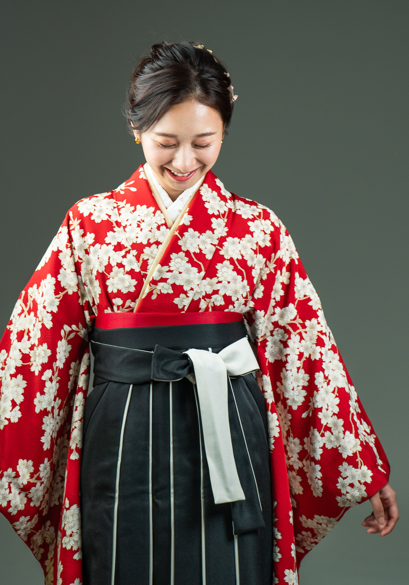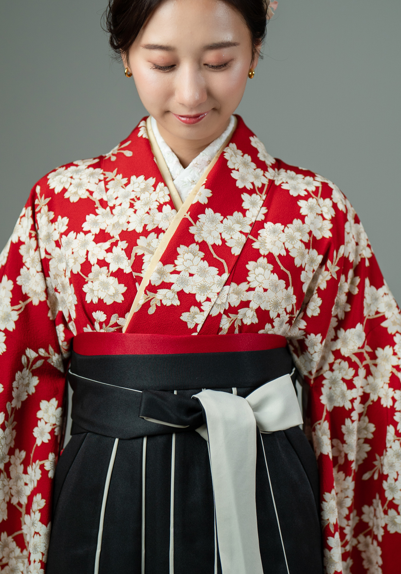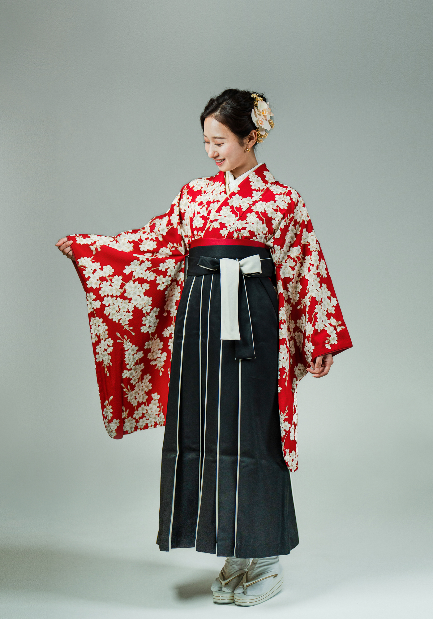 正絹の小振袖です。袴と合わせて卒業式にお召頂けます。キモノプロオリジナルのなので誰ともかぶりません。赤色に白い桜と古典的な柄ですが、根強い人気のかわいい着物です。袴の色は変更可能です。