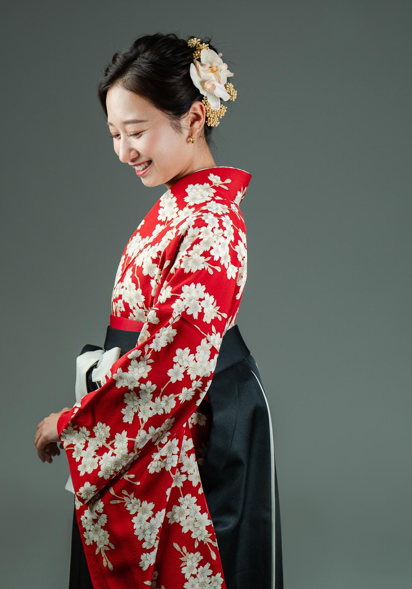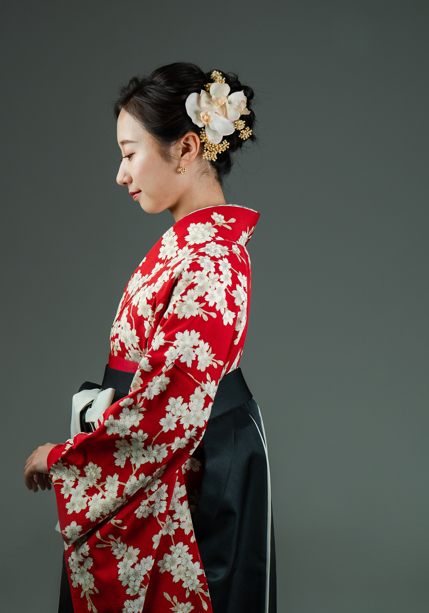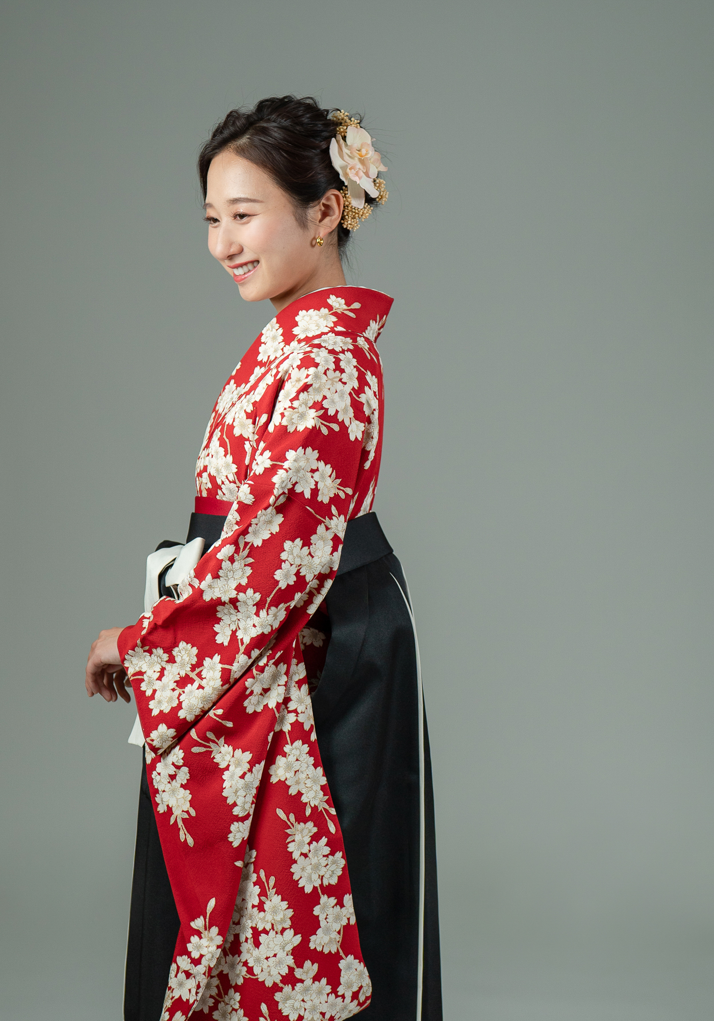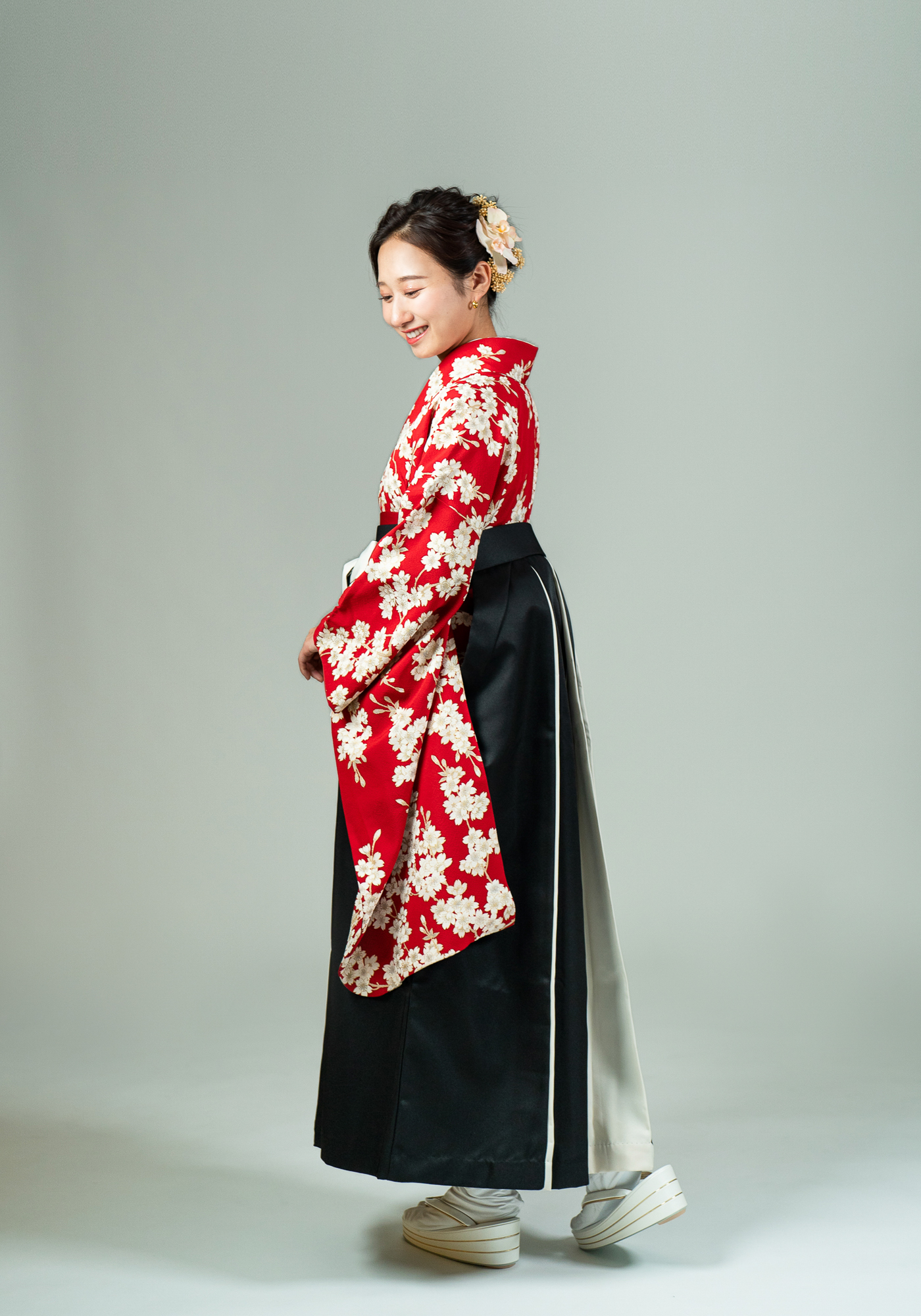 正絹の小振袖です。袴と合わせて卒業式にお召頂けます。キモノプロオリジナルのなので誰ともかぶりません。赤色に白い桜と古典的な柄ですが、根強い人気のかわいい着物です。袴の色は変更可能です。