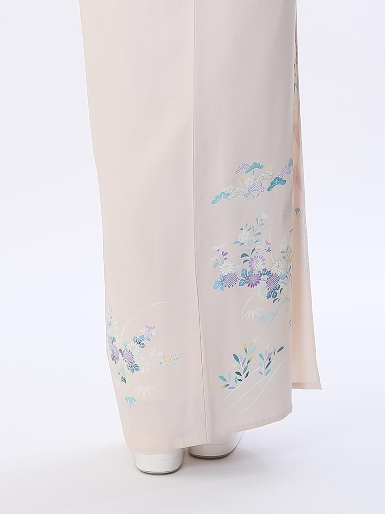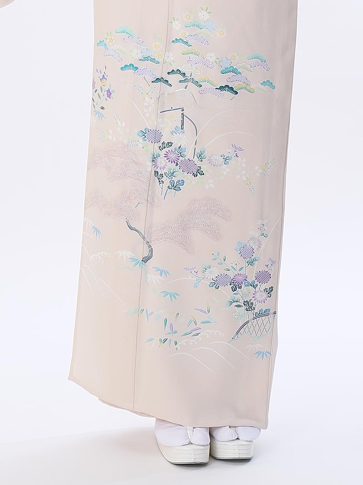 5月後半~6月、9月~10月半ばまでご利用いただける単衣訪問着です。生地も単衣向きの生地をつかっているので、清涼感もございます。松や四季の花が描かれており、松のブルーの色目がとてもきれいです。5月後半~6月なら帯や小物は夏物、9月~10月半ばなら冬物の帯や小物を使用します。重ね衿は付けないで着用します。