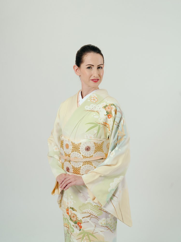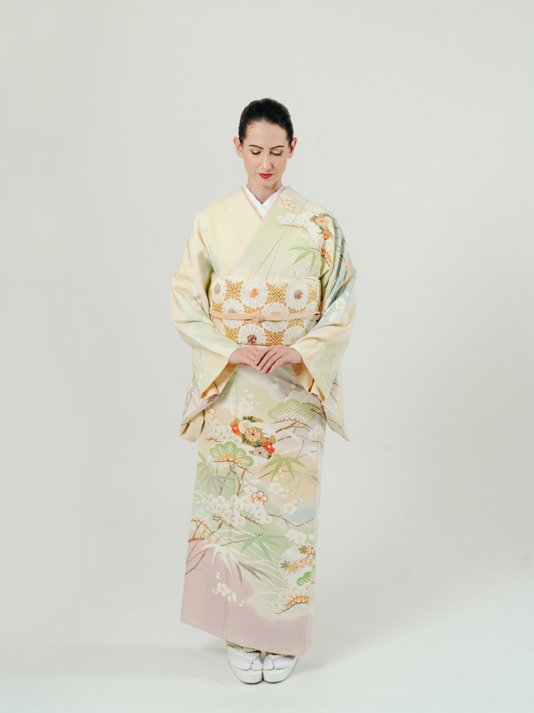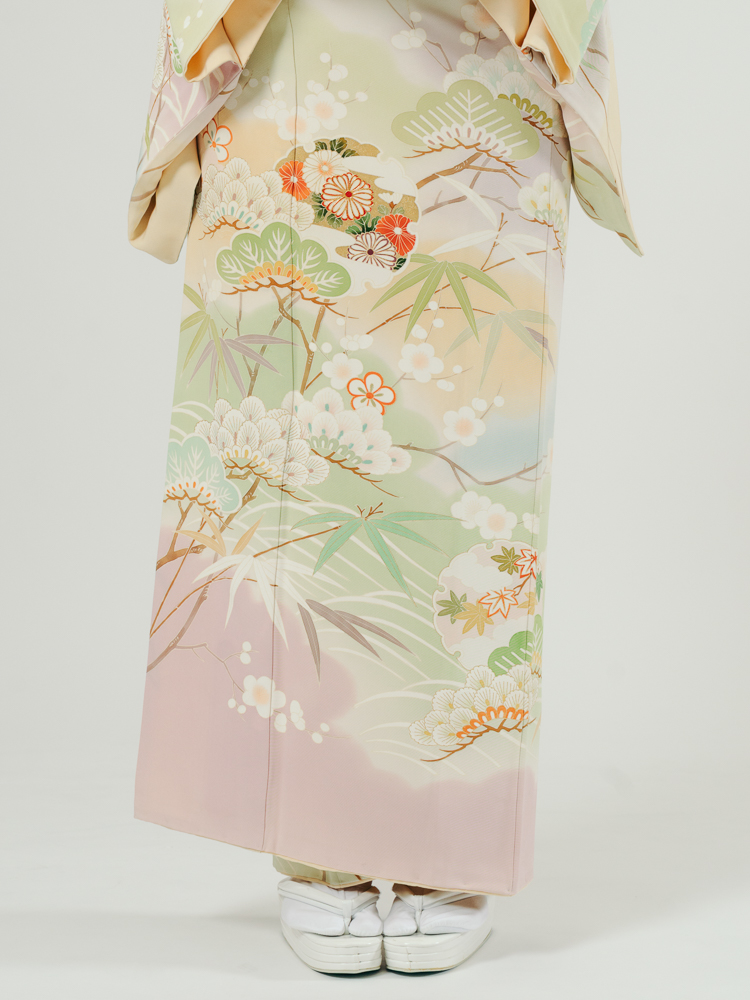 10月~5月までお召いただける最高級の訪問着です。淡いぼかしが特徴の訪問着で、ノーベル賞授賞式や晩さん会などで奥様にご利用いただきました。松竹梅をモチーフにした京友禅で、ご結納されるご本人や友達の結婚式。卒業式、卒園式などの華やかなパーティに出席されるのに最適です。少し身長の高い方向けに仕立てております。