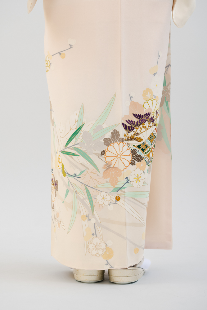 10月~5月までお召いただける京都の手描き友禅メーカーによる訪問着です。地色は発色のきれいな淡いピンク。グラデーションでクリーム色もはいります。笹や七宝などが上品に描かれています。結婚式や卒入園式、お茶席などどんな場面にもふさわしいお着物です。