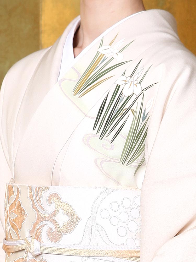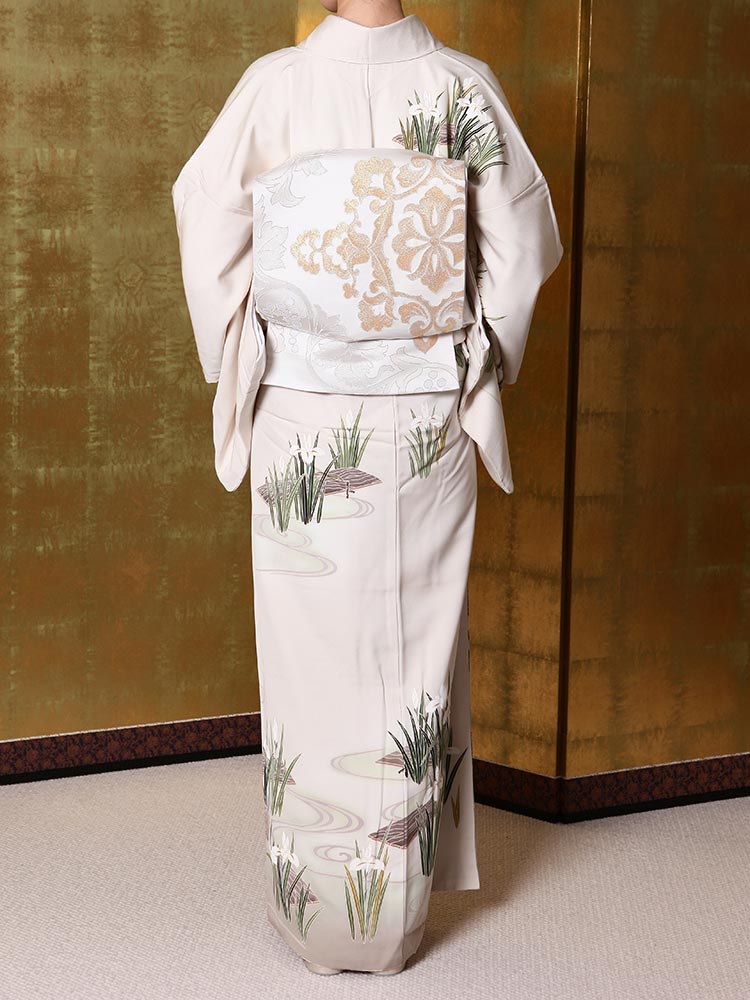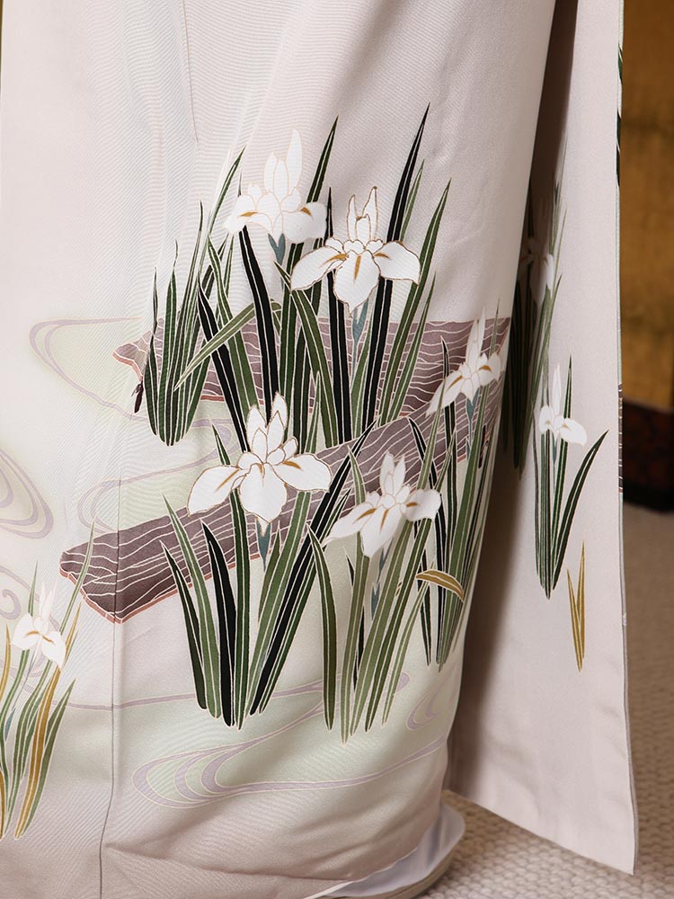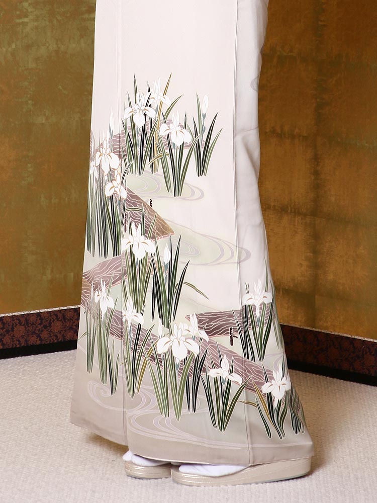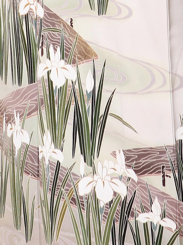 10月~5月までお召いただける訪問着です。落ち着いたグレー系の地色に菖蒲の柄が上品です。季節感のある着物ですので、5月頃にある結婚式やイベント等にオススメ。