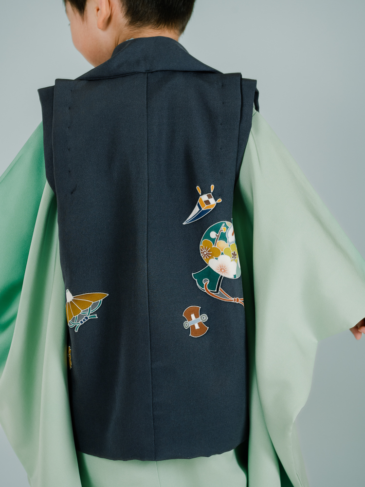 【高級七五三・正絹着物レンタル】三才の男の子用被布セット 着物:グリーン色 被布:グレー地に宝尽くし・打ち出の小槌柄 品番KD-1008