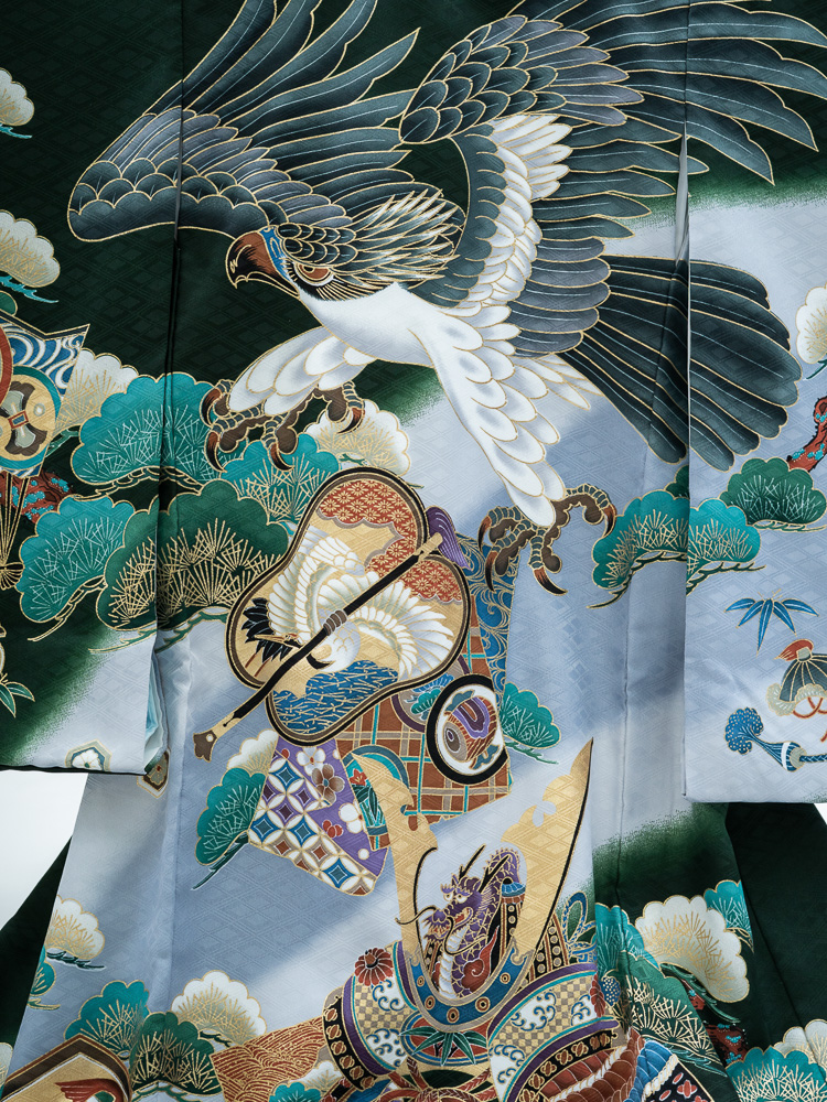 男の子用の産着です。深い緑に、鷹や兜が描かれています。
