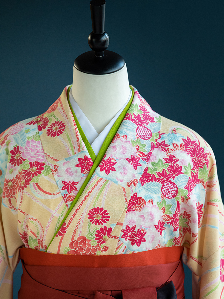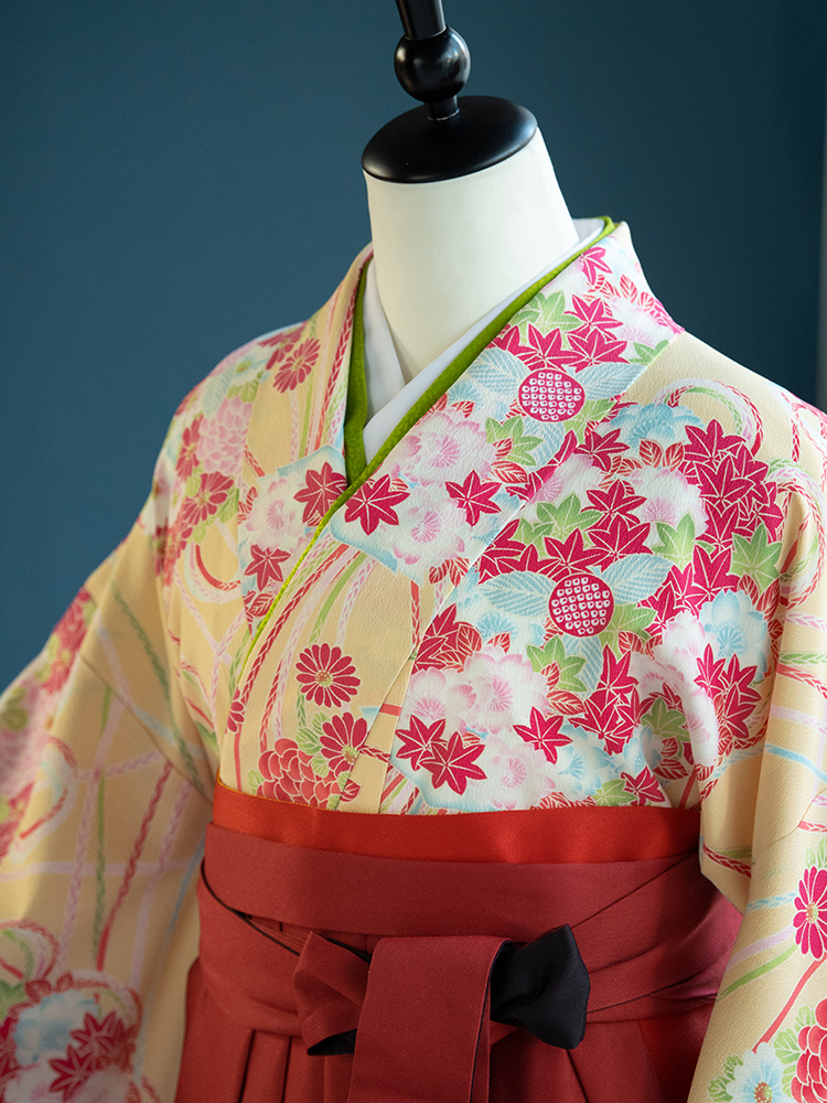 ■【高級卒業式袴レンタル】n-001 黄色に花の丸文と組紐 サイズ 花の丸文