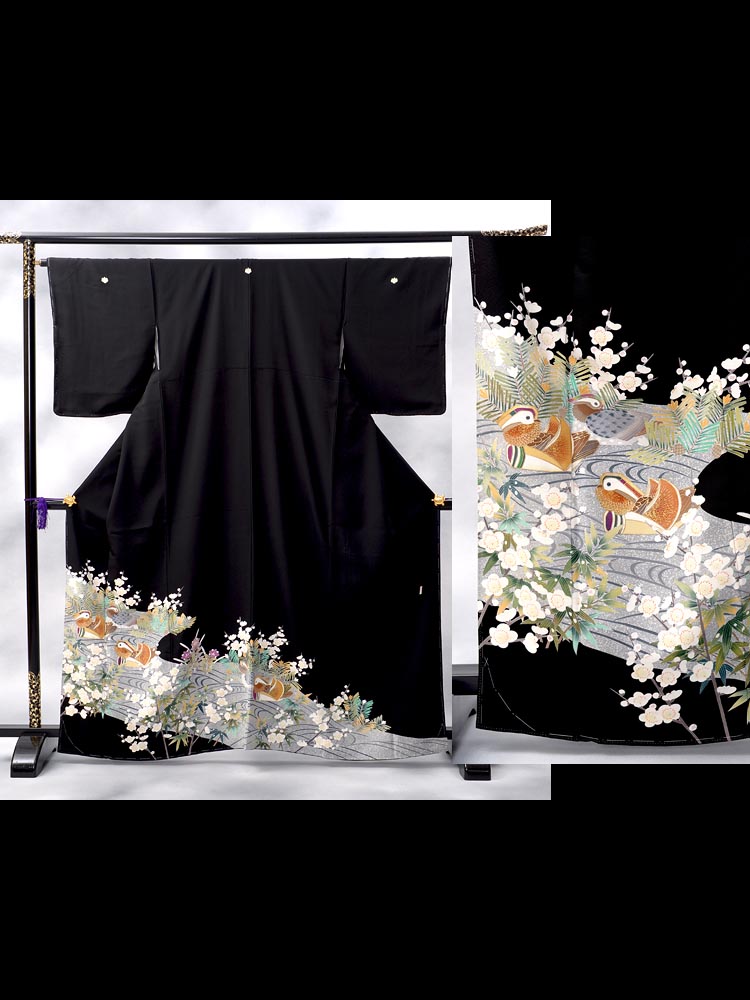 【高級黒留袖レンタル】t-435 おしどり柄・小さいサイズ MSサイズ 鴛鴦