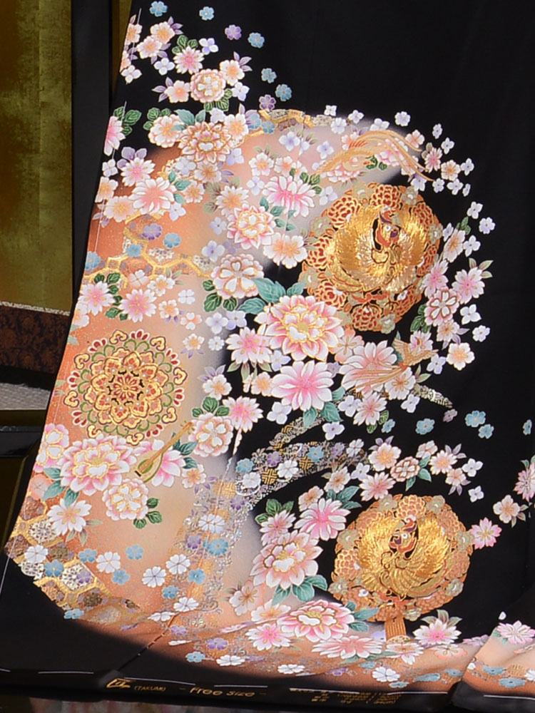 金駒刺繍の鳳凰と洋花が描かれたチャペルウエディング向きの黒留袖です。幅広対応なので、ヒップサイズ110cm以上の方にお薦めです。
