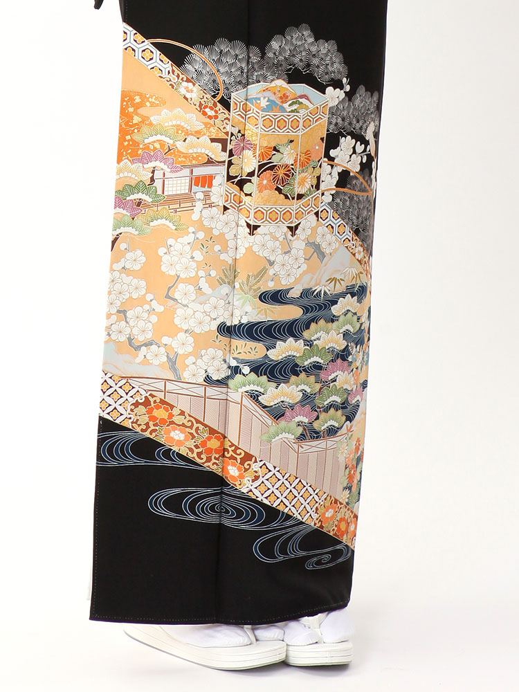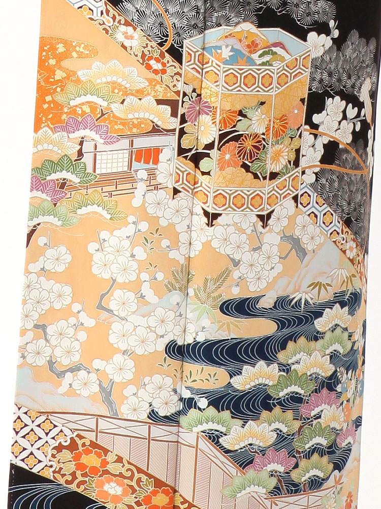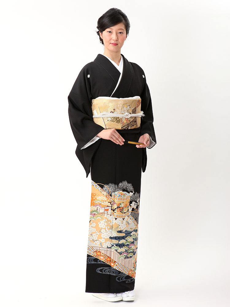 京都でも有数の京友禅染色工場による留袖を特別に少し幅広に仕立ててレンタルに致しました。サイズは、身長160cm・ヒップサイズ100cmの方を中心にしております。上質の染めには、品質のよい生地を使います。黒の濃さが良く、柄の色もはっきりくっきりとしていて、見るからに上等の黒留袖とわかるレベルの商品です。基本的に、貸衣装店には出回らないものなので、新郎新婦のお母様にお薦めです。また、色鮮やかな為、神前式、仏式はもちろんのこと、チャペルでの式にも合います。
